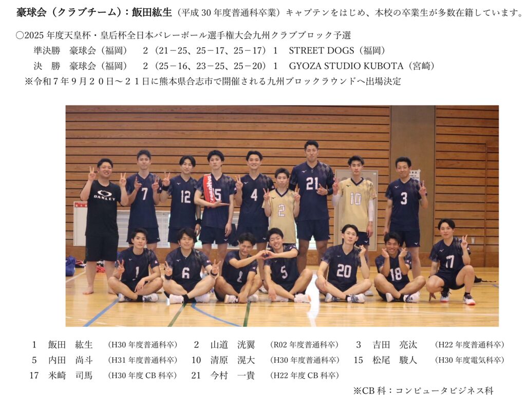 本校男子バレーボール部の卒業生が多く所属している豪球会(クラブチーム)が2025年度天皇杯・皇后杯全日本バレーボール選手権大会九州クラブブロック予選で優勝し、九州ブロックラウンドへの出場が決定しました!