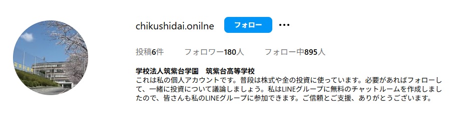 さて、現在、本校の公式Instagramアカウント「学校法人筑紫台学園 筑紫台高等学校【公式】(@chikushidai.online)」と非常によく似たアカウント「学校法人筑紫台学園 筑紫台高等学校(@chikushidai.onilne)」が確認されております。