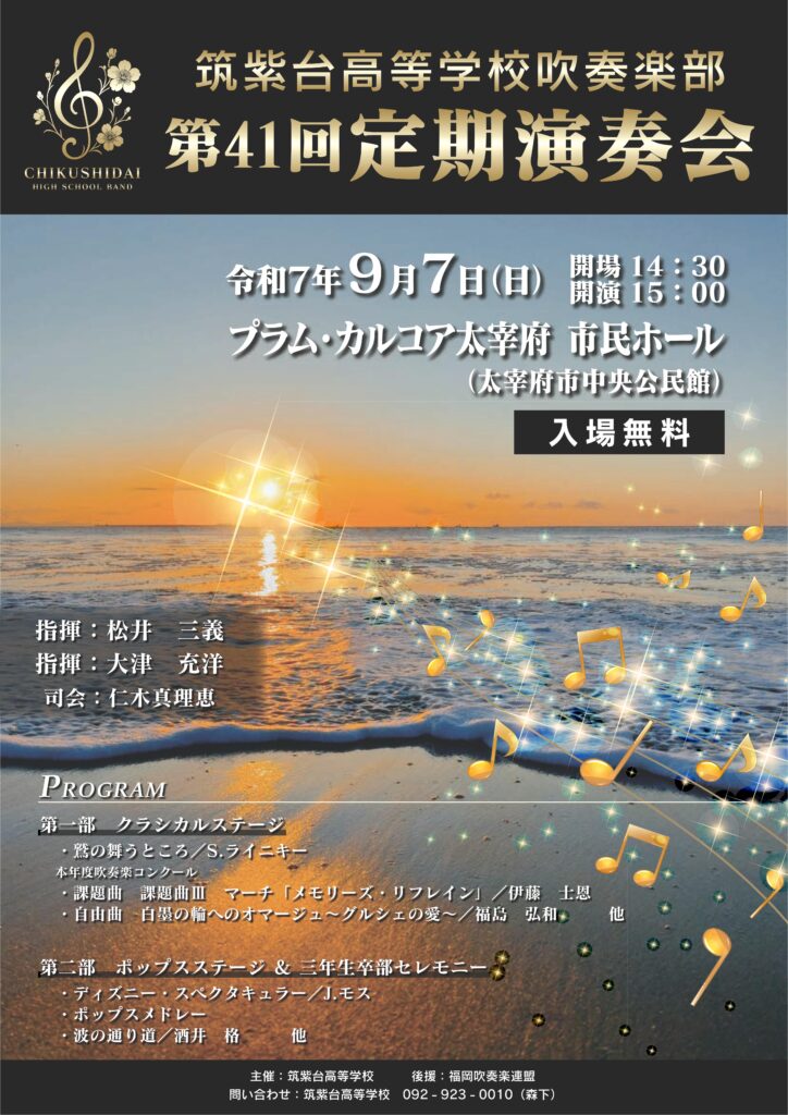 今回の演奏会をもって、吹奏楽部をリードしてきてくれた3年生が引退となります。演奏会の最後には、3年生の卒部セレモニーを行う予定です。今回の演奏会が、全学年で演奏する最後の演奏会であり、2025年度筑紫台高等学校吹奏楽部の集大成を披露する場となります。「吹奏楽は人数じゃない」という言葉を胸に練習に励んできた成果を発揮し、皆様の心に響く音楽を届けられるよう、部員全員で、精一杯演奏させていただきます。